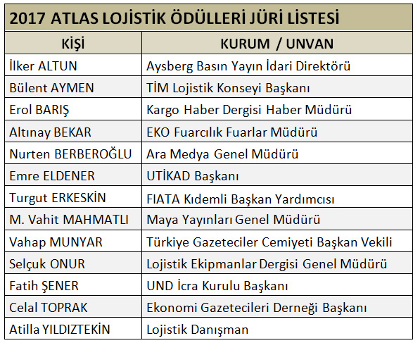 Yarışmanın değerlendirmeleri yapan ve sonuçları onaylayan jürisi, sektöre yıllarca hizmet vermiş uzman gazeteci ve sivil toplum kuruluşu yöneticilerden oluşuyor. ATLAS jürisine; yarışmanın oluşumuna ve gelişmesine katkı sağlayan sivil toplum örgütü yöneticileri FIATA Kıdemli Başkan Yardımcısı ve DEİK Lojistik İş Konseyi Başkanı Turgut Erkeskin ve UND İcra Kurulu Başkanı Fatih Şener ile sektörün önde gelen yayınlarının yöneticileri İlker Altun, Erol Barış, Altınay Bekar, Nurten Berberoğlu, Vahit Mahmatlı ve Selçuk Onur ile lojistik danışman Atilla Yıldıztekin’in yanısıra bu yıl önemli isimler dahil oldu. Türkiye İhracatçılar Meclisi Lojistik Konseyi Başkanı Bülent Aymen, Ekonomi Gazetecileri Derneği Başkanı Celal Toprak, Türkiye Gazeteciler Cemiyeti Başkan Vekili ve ekonomi yazarı Vahap Munyar ATLAS’ın jürisine katıldı. UTİKAD Başkanlığını devralan Emre Eldener de ATLAS jürisindeki yerini aldı.