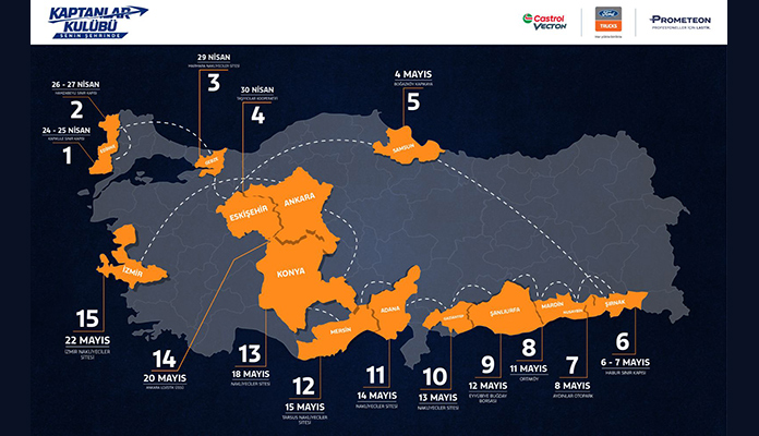 Ford Trucks, Castrol ve Prometeon’un hayata geçirdiği “Kaptanlar Kulübü Senin Şehrinde” etkinliğinin detaylı takvimine göre roadshow 24 Nisan’da Edirne Kapıkule Sınır Kapısı’nda başlayacak ve 22 Mayıs’ta İzmir Nakliyeciler Sitesi’nde sona erecek.